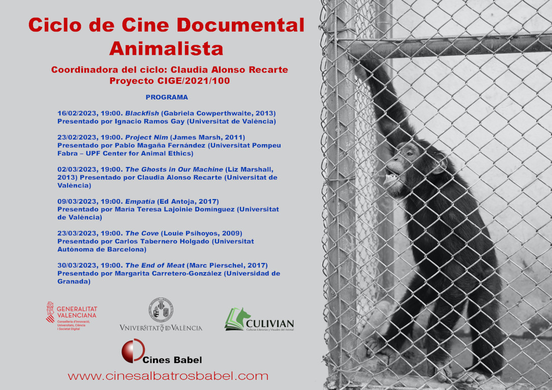 Bajo la financiación de la Conselleria d’Innovació, Universitats, Ciència i Societat Digital de la Generalitat Valenciana y en el marco del Proyecto de Investigación CIGE/2021/100, CULIVIAN organiza, en los Cines Babel en Valencia, un Ciclo de Cine Documental Animalista. Por medio de una selección de seis películas que se proyectarán a lo largo de seis semanas, se busca crear un espacio de reflexión y de debate en el que los múltiples problemas relacionados con la ética animal, los derechos de los animales y/o el bienestar animal sean expuestos dentro del marco técnico y narrativo del género documental. Las películas serán presentadas por expertos en la materia, los cuales, tras la proyección, invitarán al público a reflexionar y conversar sobre el documental en cuestión. Véase el programa para más información.