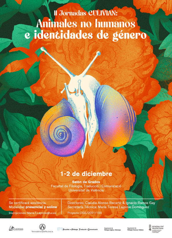 Bajo el auspicio del Proyecto de Investigación “Representaciones de masculinidades en documentales en defensa de los animales en lengua inglesa (2000-2021)” (CIGE/2021/100), financiado por la Conselleria d’Innovació, Universitats, Ciència i Societat Digital, CULIVIAN organiza sus segundas jornadas los días 1 y 2 de diciembre de 2022 en el Salón de Grados de la Facultat de Filologia, Traducció i Comunicació (también disponible en modalidad online). El objetivo de las mismas es ofrecer una visión interdisciplinar de las múltiples cuestiones que unen y son transversales a los debates estéticos, sociales y culturales en torno a la cuestión de los animales no humanos y las identidades de género, con el fin de remarcar no sólo los paralelismos entre el especismo y el sexismo, sino también ofrecer un espacio discursivo que permita apreciar la evolución artística, histórica, legal y filosófica en torno a la articulación cultural de la otredad.