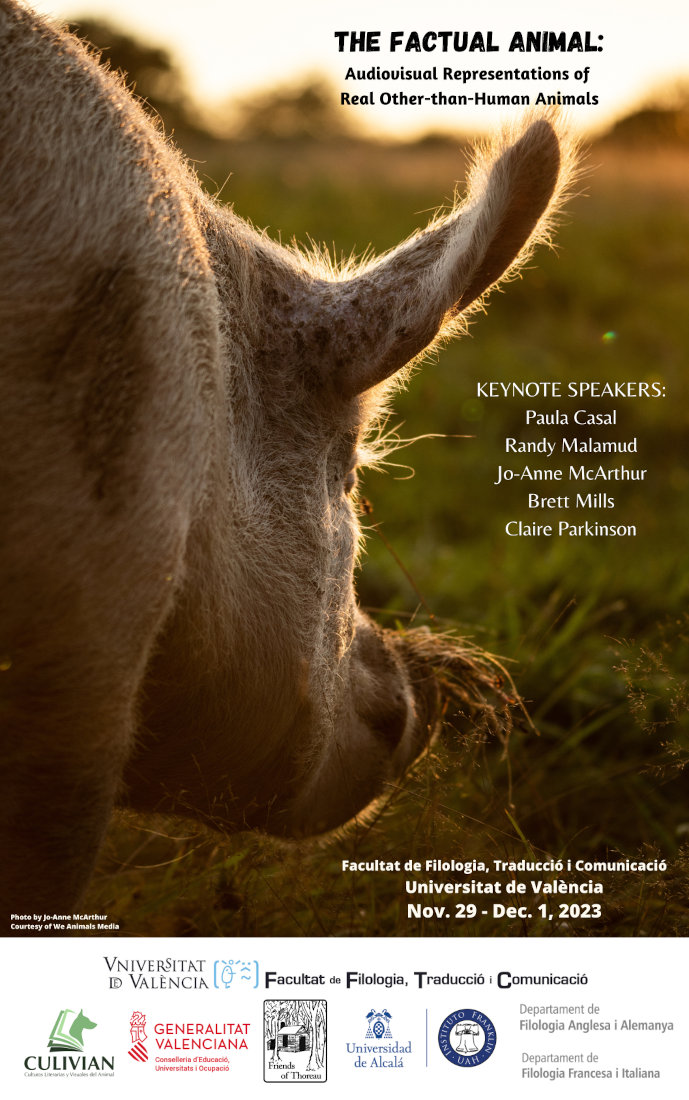 El congreso internacional “The Factual Animal: Audiovisual Representations of Real Other-than-Human Animals” forma parte del proyecto CIGE/2021/100, “Representaciones de masculinidades en documentales en defensa de los animales en lengua inglesa (2000-2021),” otorgado por la Conselleria d’Educació, Universitats i Ocupació, y cuenta con la coorganización del grupo de investigación CULIVIAN (“Culturas literarias y visuales del animal”), el Departament de Filologia Anglesa i Alemanya y el Departament de Filologia Francesa i Italiana. El objetivo del congreso es reunir a expertos académicos y profesionales para explorar y debatir sobre las implicaciones éticas y estéticas derivadas de los procesos de representación de animales no humanos en contextos postmodernos (audio)visuales, cobrando especial interés el cine (especialmente el documental), la fotografía, las redes sociales y los medios de comunicación. También se analizarán las formas de representación cultural por las que se “enmarca” a los animales no humanos para su consumo estético (zoos, museos y exposiciones, en la industria del turismo) y los medios por los que se manufactura y perpetúa el consentimiento colectivo a su explotación. El congreso cuenta con la presencia, como plenarios, de Randy Malamud (profesor de Georgia State University y autor de libros como An Introduction to Animals and Visual Culture y Reading Zoos: Representations of Animals and Captivity), Brett Mills (profesor de Edge Hill University y autor de Animals on Television: The Cultural Making of the Non-Human), Claire Parkinson (profesora de Edge Hill University y autora de Popular Media and Animals), Paula Casal (profesora de la Universitat Pompeu Fabra y co-autora, junto a Peter Singer, de Los derechos de los simios) y de la mundialmente premiada Jo-Anne McArthur (fundadora de We Animals Media, la primera agencia de fotoperiodismo animalista). El congreso coincide con la exposición “Ocultos: Animales en el Antropoceno”, que recoge el trabajo fotoperiodístico de fotógrafos de We Animals Media, y que está abierta a todos los públicos hasta el 10 de diciembre de 2023 en el Centro Cultural La Nau. La exposición ha sido organizada por CULIVIAN y esponsorizada por el programa Friends of Thoreau de la Universidad de Alcalá.